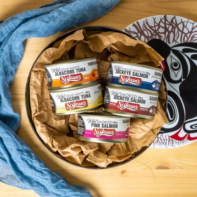 Indulge in The Five Star Round Gift Tin, featuring canned smoked wild salmon and canned albacore tuna. Treat yourself or someone special to a delectable seafood experience with this gourmet selection.
