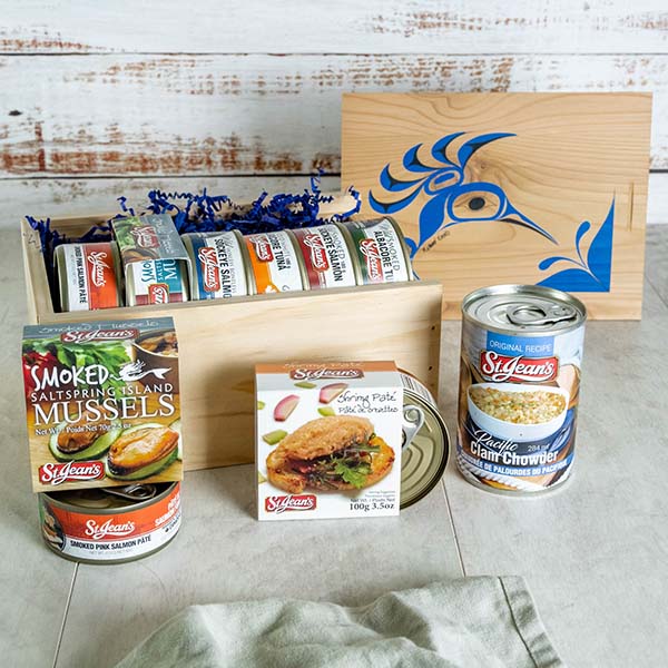 The St. Jean’s Wooden Gift Box (Hummingbird) contains ten quality seafood products in a wooden box illustrated by Coast Salish artist Richard Krentz. A classy gift that represents the best that the Pacific Coast has to offer–and an absolute must for fans of gourmet seafood.