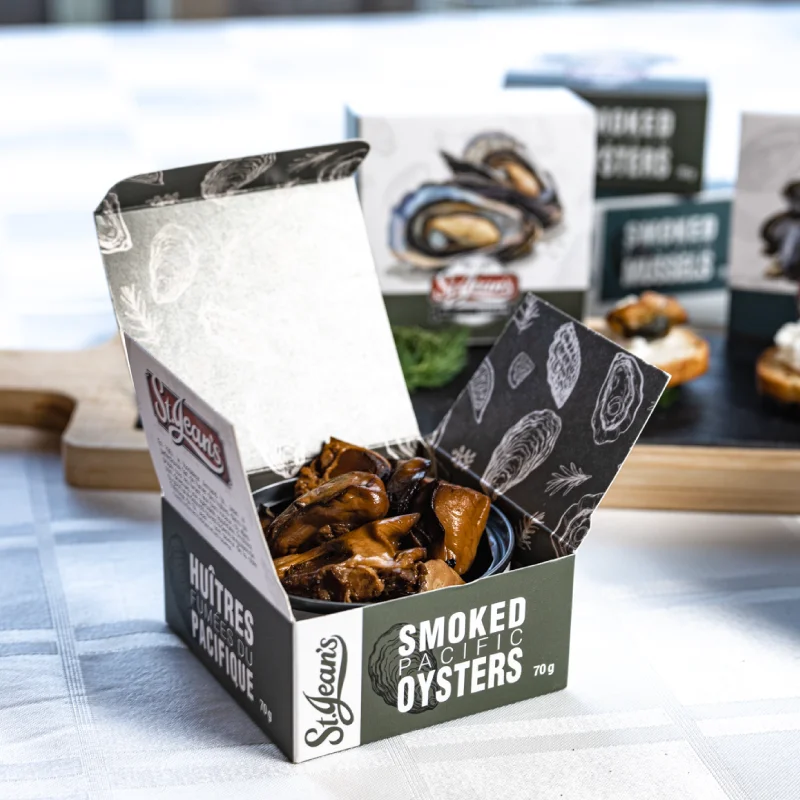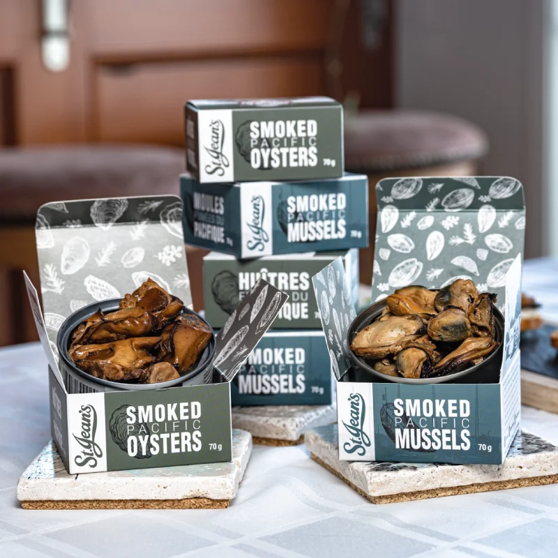 Our Shellfish Six-Pack pairs three cans of our famous Pacific smoked oysters with three cans of delectable smoked Salt Spring Island mussels. Serve together—or enjoy on their own!